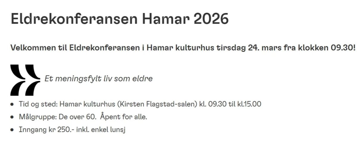Klikk her: https://www.hamar.kommune.no/eldrekonferansen/ så vil du finne hele programmet og mer informasjon om konferansen, herunder muligheter for påmelding.